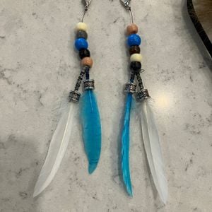 Feather charm: non-stretchy wildfire string, fake feathers, beads, hot glue, fabric glue)